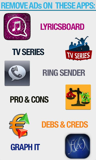 With this key you will be able to add an unlimited number of TV shows in TV Series and the ads will be removed in all of our applications (TV Series, Lyricsboard, Graph it, Rig sender, Debs & Creds and Pro & Cons).